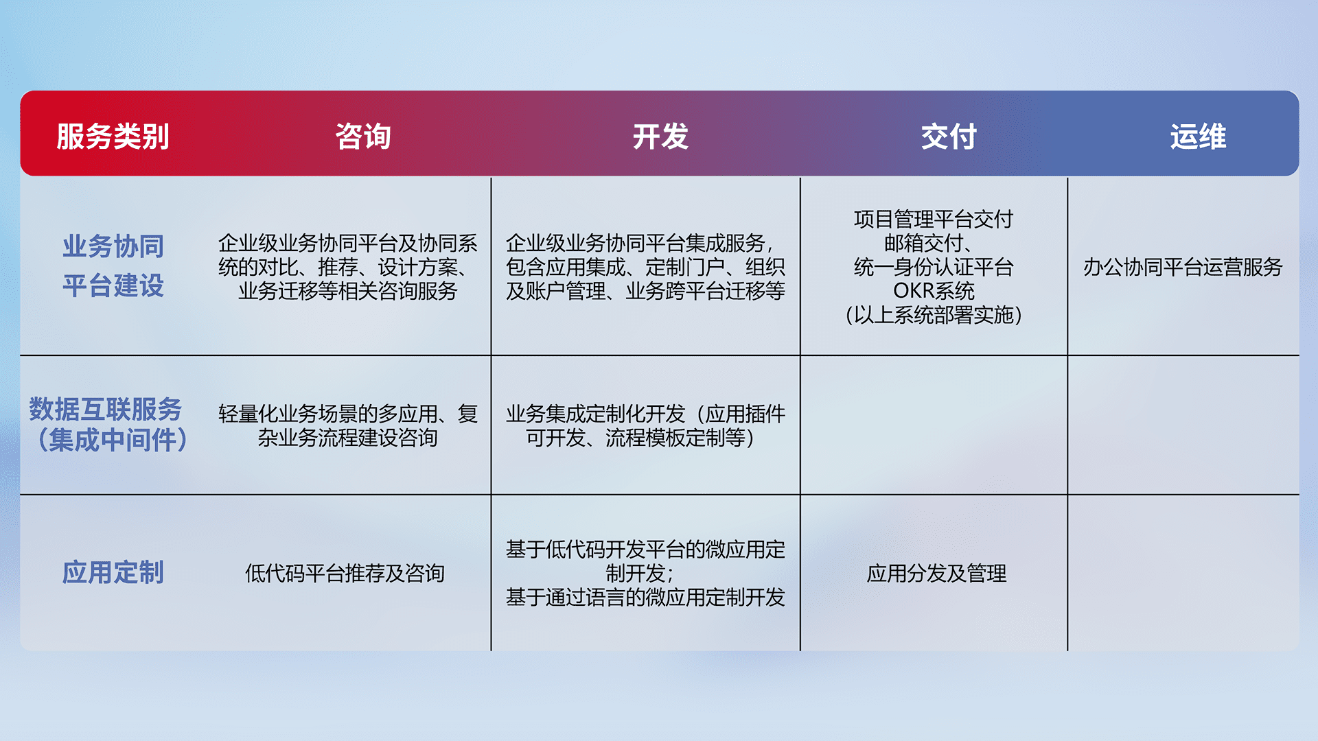 针对钉钉、、、企微、、IDaas等平台级产品提供产品的规划、、、方案、、交付、、、定制化开发等服务,,,,实现如统一协同办公、、智能客户服务、、、混合会议管理、、、智能数据查询、、等业务场景,,,,实现数字化转型。。。