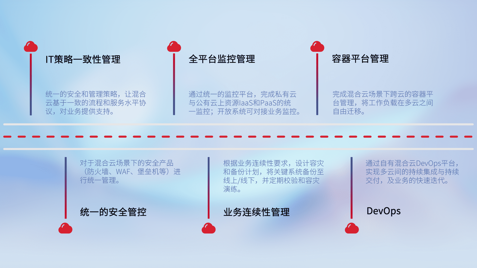 通过多云纳管,,以统一的资源数据模型把客户的云资源进行抽象和封装,,,,进而实现对多云资源的统一操作,,保障云资源管理的可靠性、、、、稳定性与可用性。。。量身定制化运维内容,,配置、、开发运维、、、补丁管理、、、备份、、、、监控、、、认证和访问管理、、、、审计和日常巡检等,,保障在用云过程中的可靠度,,稳定度以及高可用率。。。